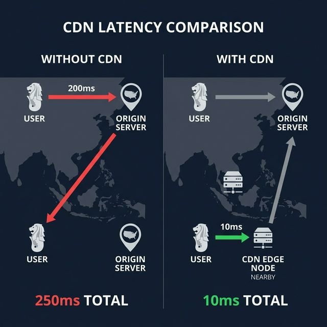 With CDN: User in Singapore → Singapore edge cache = 10ms, served from cache
