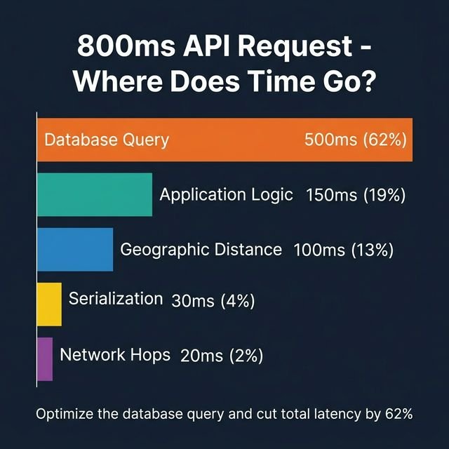 A poorly indexed query scanning 1 million rows takes 500–2000ms. The same query with a proper index takes 5–10ms. Database optimization has a 100x impact on latency — nothing else comes close.